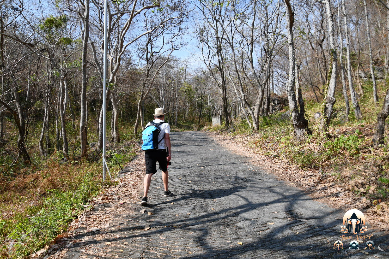À l’arrivée, on nous propose d’ailleurs de monter en 4x4, mais nous sommes bien décidés à faire la montée à pied. Phnom Sampeau est à la fois un site religieux, un lieu de mémoire lié aux Khmers rouges et l’un des points les plus connus des environs de Battambang, notamment pour ses grottes et la fameuse Bat Cave. Nous payons donc simplement notre entrée, passons le poste de contrôle et commençons à gravir la route.