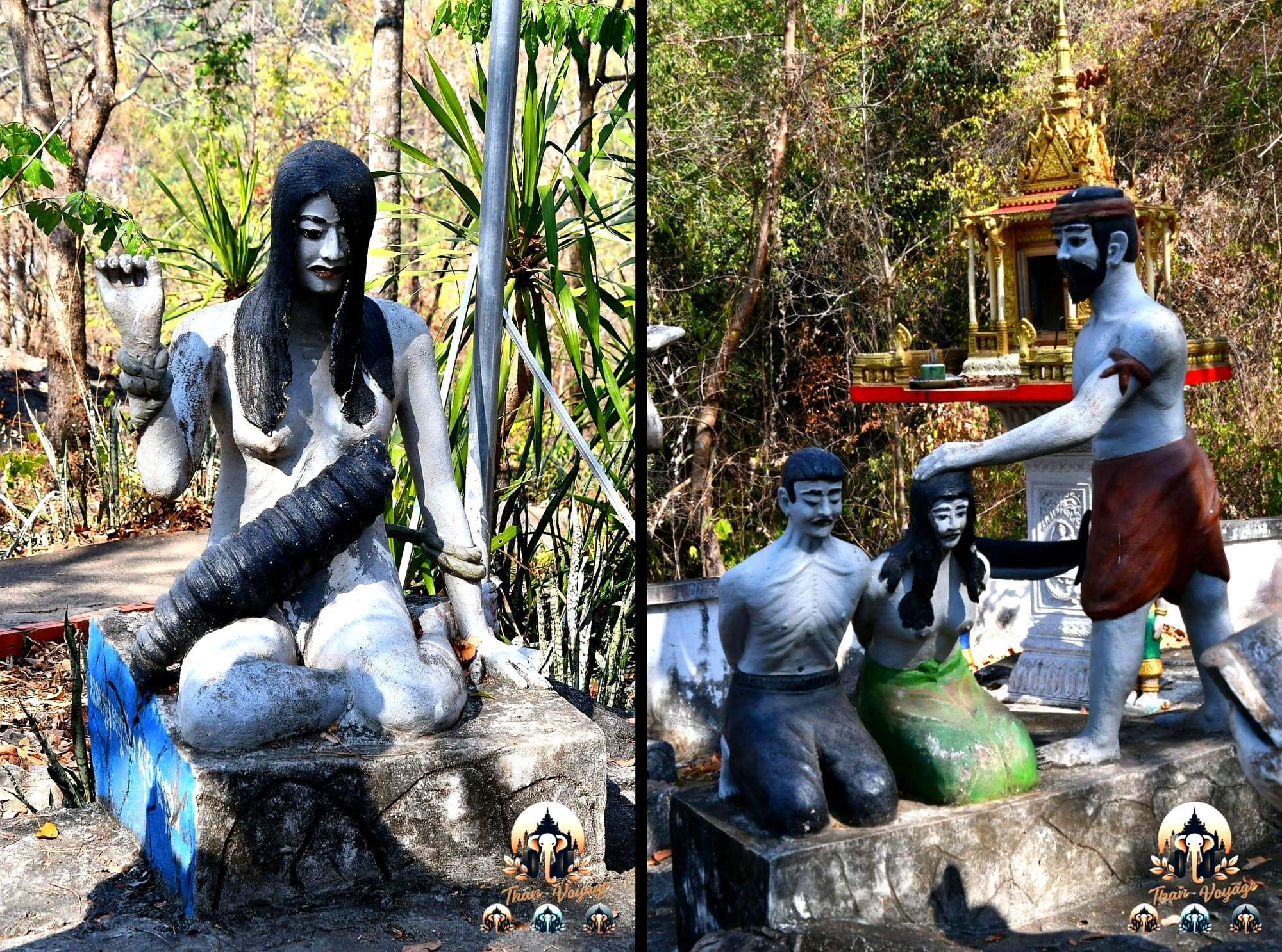 Avant même d’atteindre les grottes, nous passons devant plusieurs sculptures modernes représentant différentes scènes de torture attribuées aux Khmers rouges. Leur violence visuelle nous frappe immédiatement. Elles font écho de façon très troublante aux peintures de Vann Nath découvertes quelques jours plus tôt au musée S21 de Phnom Penh.
