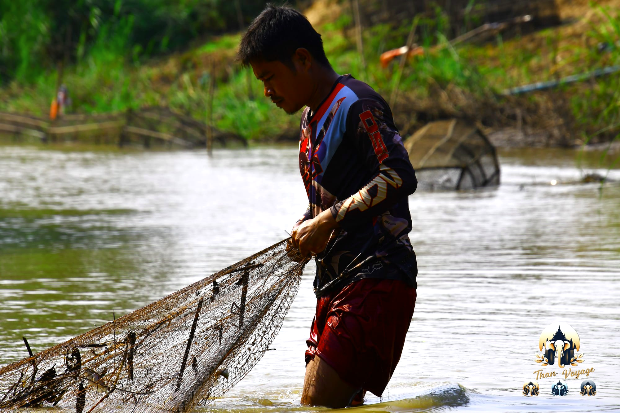 Nous croisons de nombreux pêcheurs. Certains sont sur de petites embarcations. D’autres ont littéralement les pieds dans la vase, parfois avec de l’eau jusqu’à la taille.