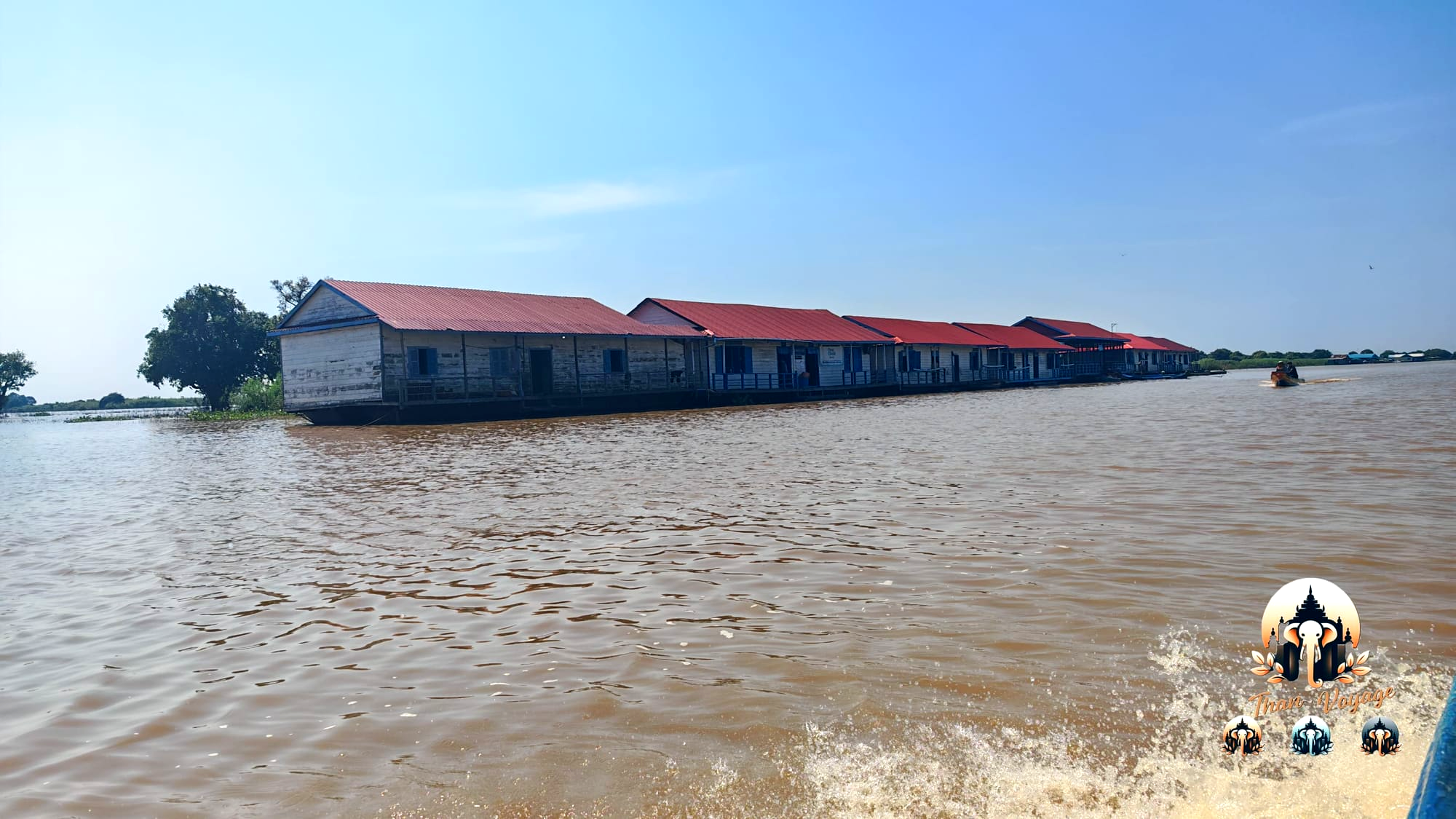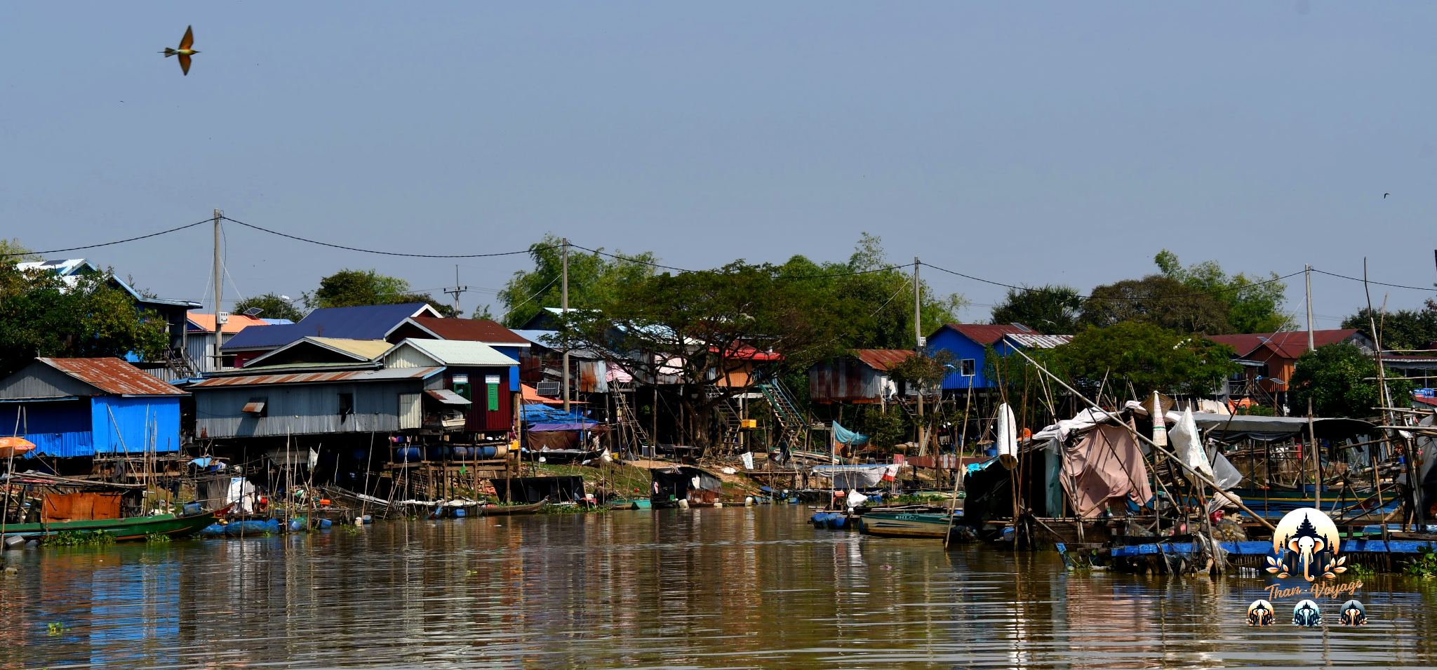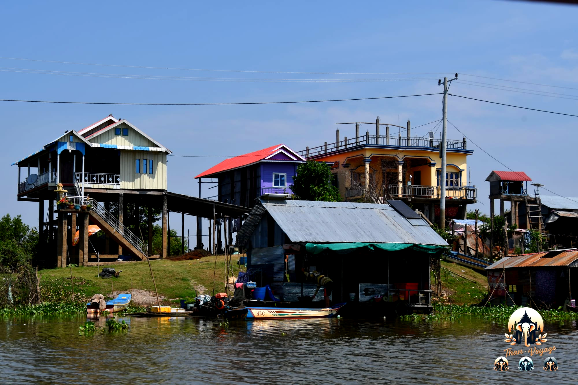Ici, deux types de maisons se côtoient : sur pilotis à l'arrière-plan, sur flotteurs à l'avant, permettant une vie plus nomade, au fil des crues du Mekong et au gonflement du Tonle Sap.