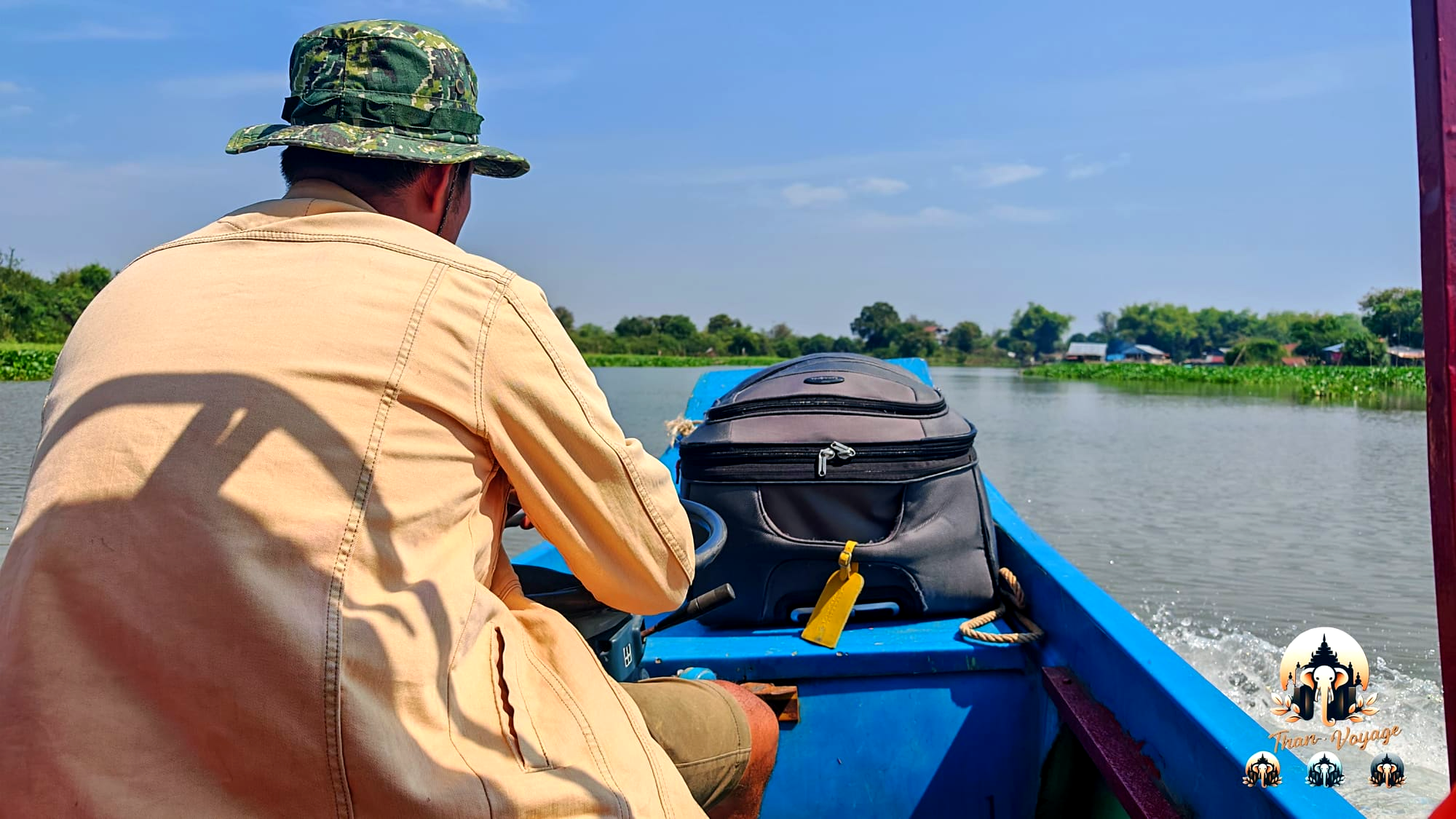 Le transfert avait été réservé deux jours plus tôt via notre hôtel. Un tuktuk vient nous chercher à 7 heures, car le point de départ varie selon le niveau de l’eau et se situe alors assez loin dans la campagne. Nous procédons au check-out sans prendre le petit déjeuner sur place, mais l’hôtel nous a préparé des paniers pique-nique pour le trajet.
