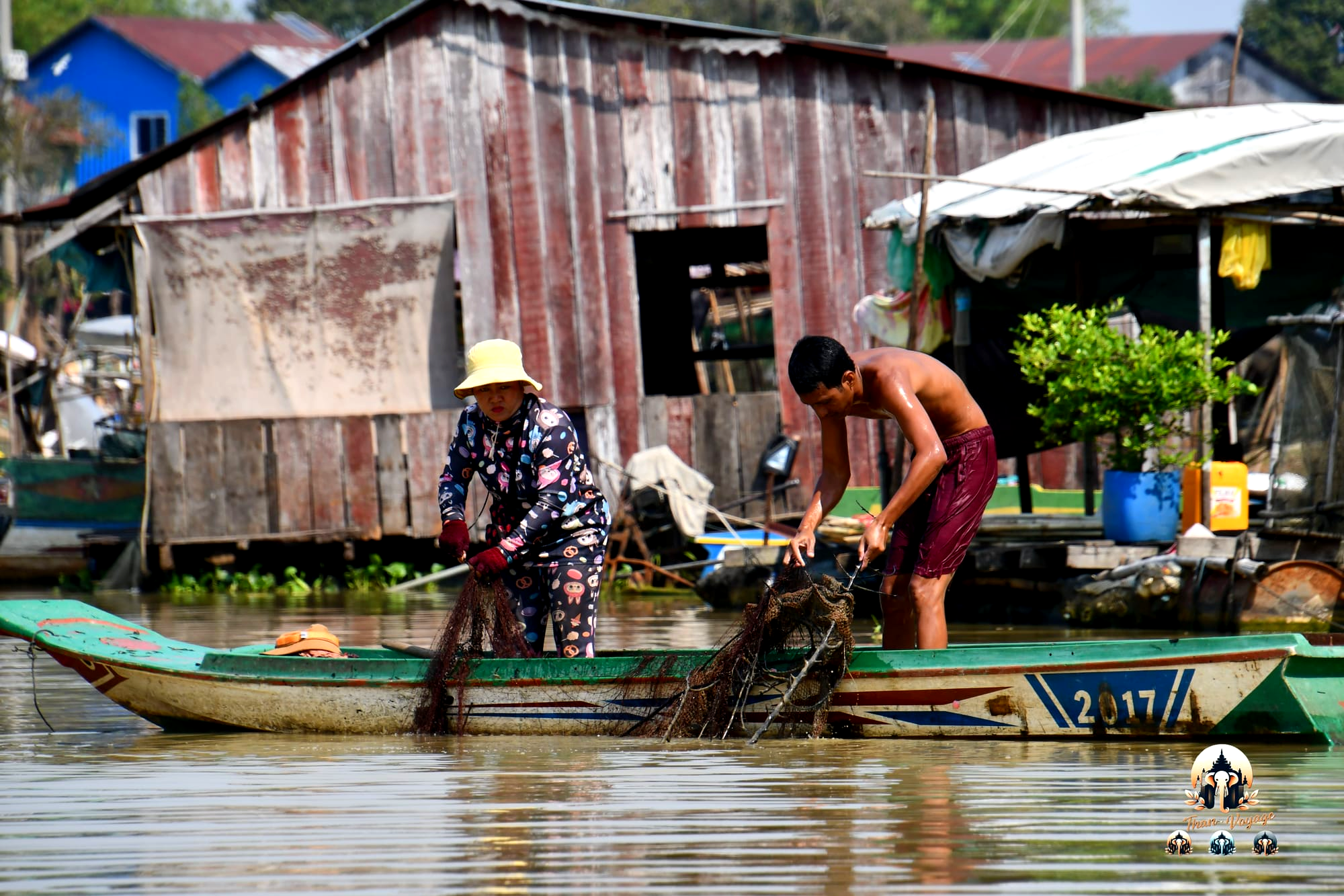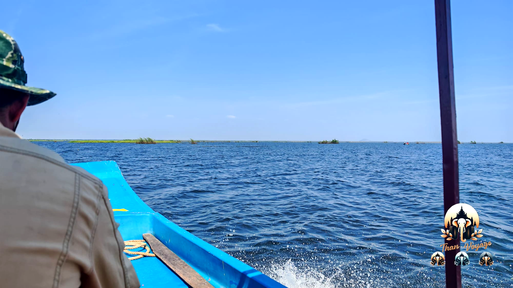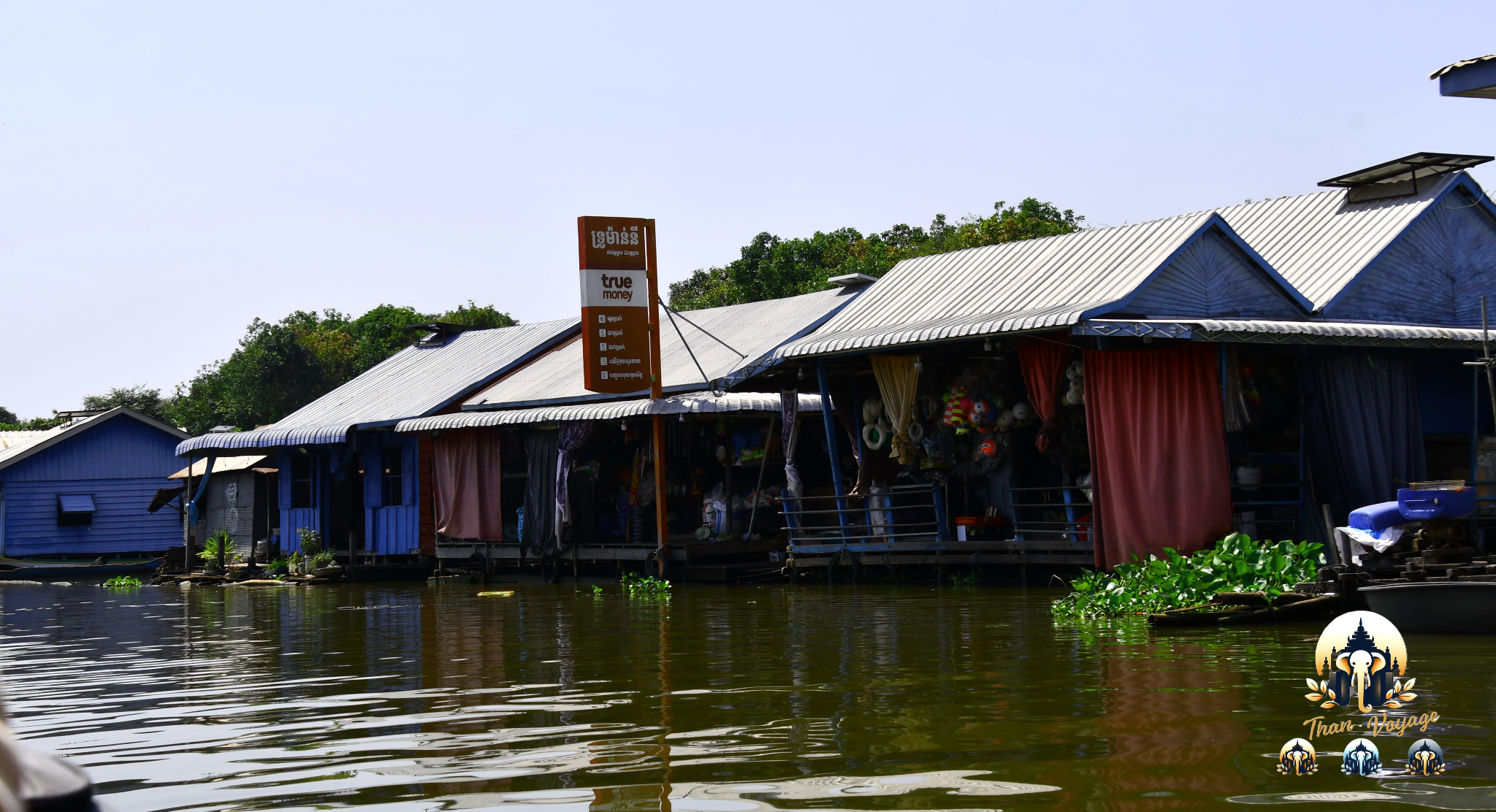 Puis, peu après la sortie de ce dédale, l’eau change soudain de couleur. Elle vire au bleu marine, et l’horizon s’ouvre brutalement : nous arrivons sur le Tonlé Sap.