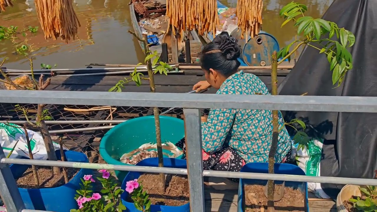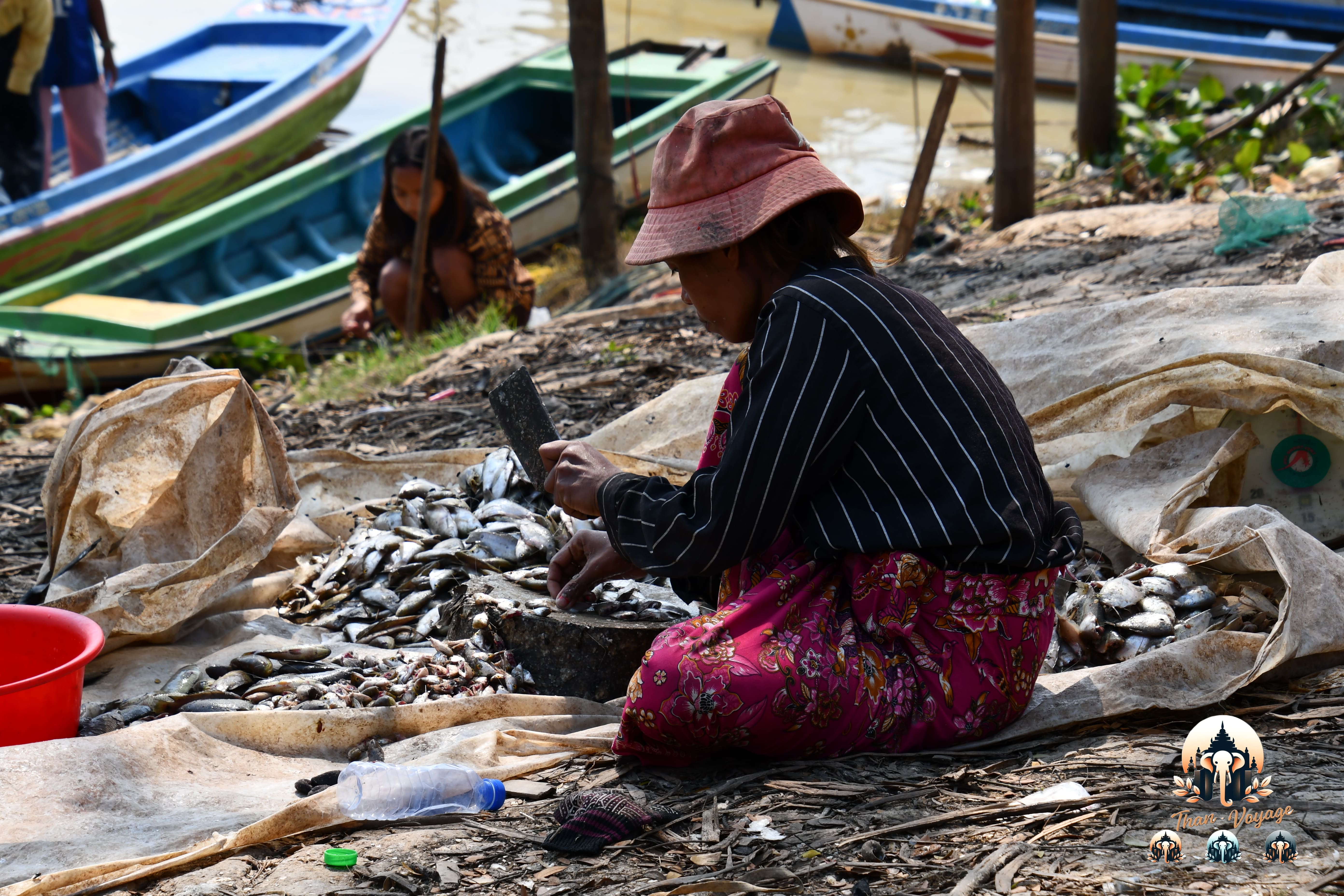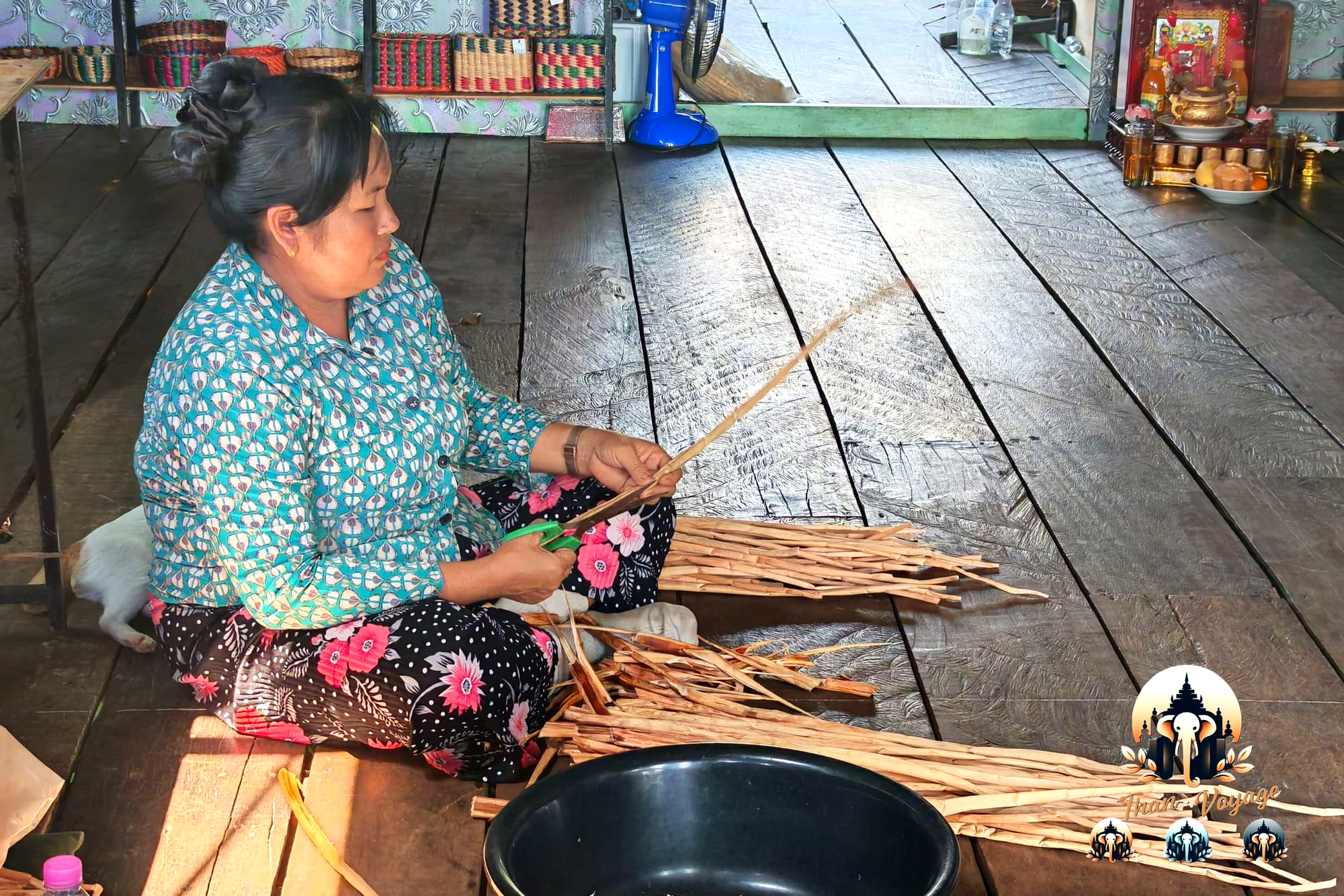 Nous poursuivons ensuite notre route sur la rivière Sangker, toujours au milieu d’autres villages flottants, avant de nous arrêter dans une maison où le capitaine veut nous montrer deux activités grâce auxquelles certaines femmes gagnent leur vie.