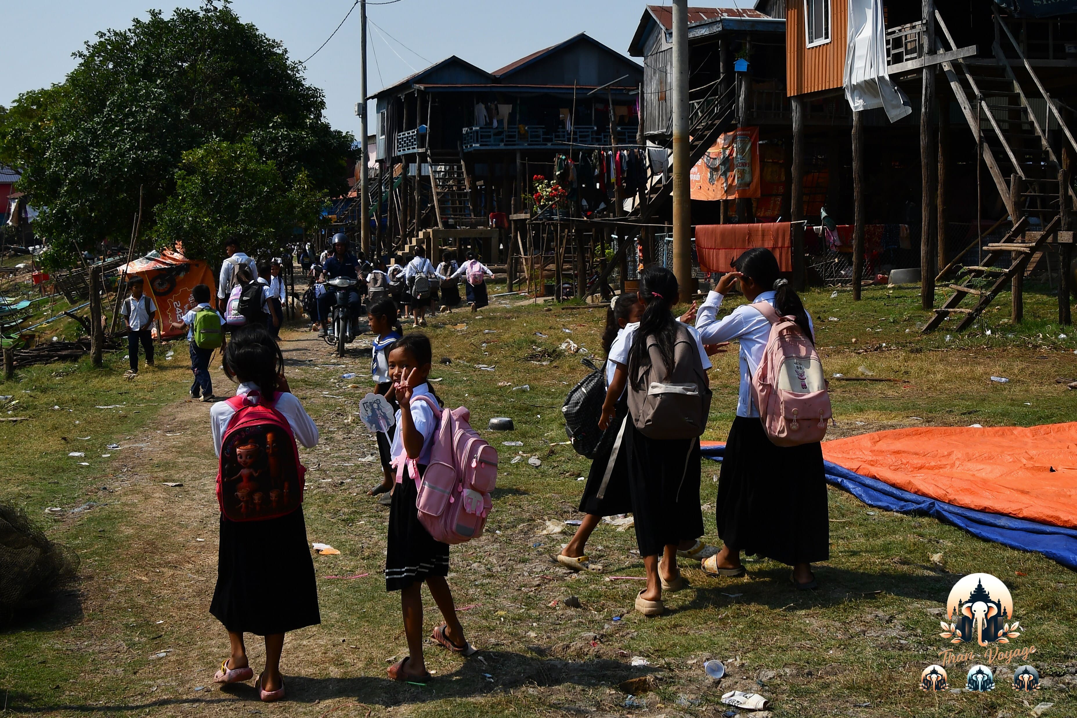 Tous les enfants du village, en uniforme, passent leur temps à nous faire de grands signes, à sourire, à nous saluer et à essayer de nous parler — malheureusement en khmer, ce qui limite nos possibilités de réponse.