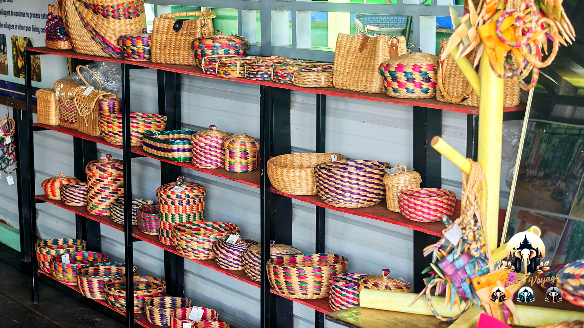 À l’intérieur, la propriétaire est assise au sol dans sa petite boutique, en train de tresser des tiges de jacinthe d’eau pour fabriquer des objets de vannerie.