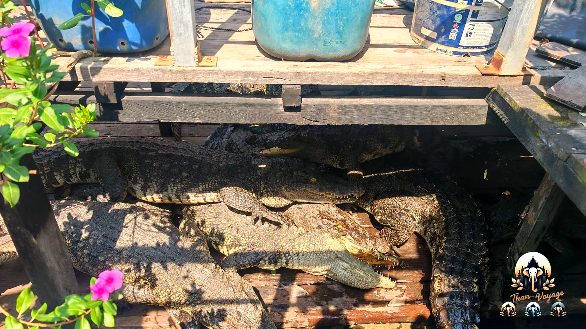 Puis elle nous invite à la suivre jusqu’à l’arrière de la maison, où se trouve un enclos en planches. Nous montons au-dessus pour observer ce qu’il contient : des crocodiles élevés là, juste derrière l’habitation. Elle en profite même pour les nourrir devant nous.