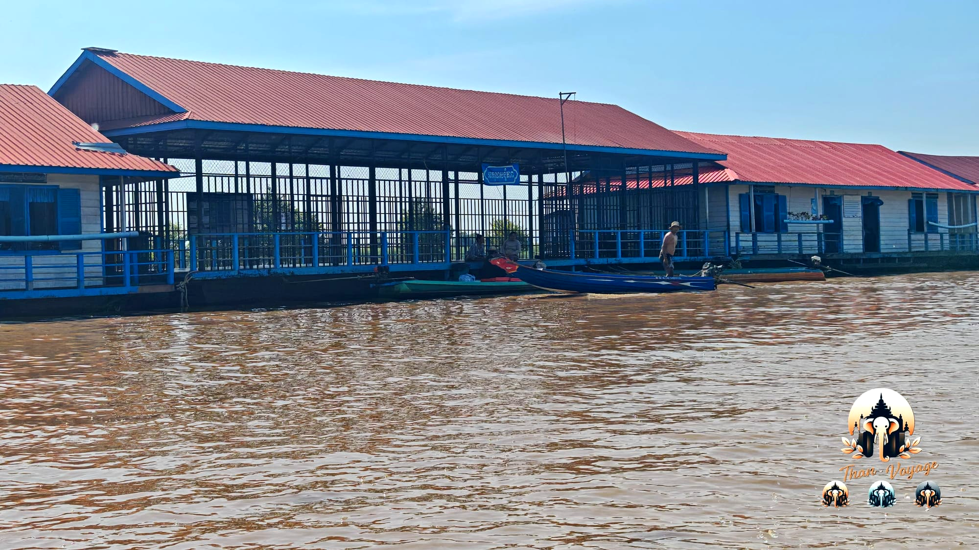 Ce qui nous frappe d’abord, c’est un immense bâtiment flottant qui est en réalité une école, avec plusieurs classes et même une cour de récréation grillagée sur l’eau. Le grillage sert essentiellement à empêcher le ballon des enfants de tomber sans cesse dans le lac.