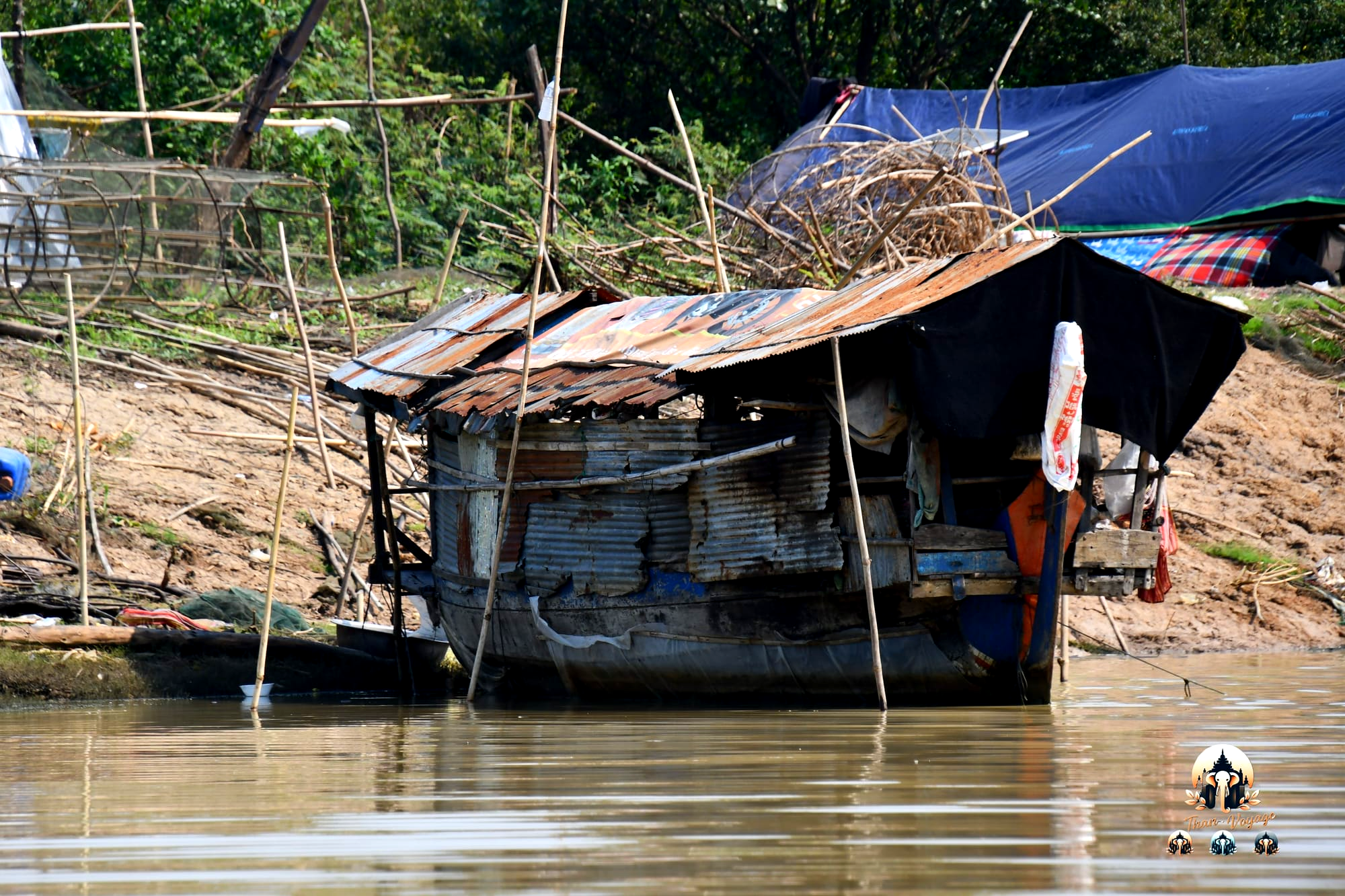 En février, la saison sèche est déjà bien avancée. Nous sommes donc débarqués avant le point d’arrivée habituel, qui se situe normalement du côté de Chong Kneas, car le niveau de l’eau ne permet plus de poursuivre normalement.