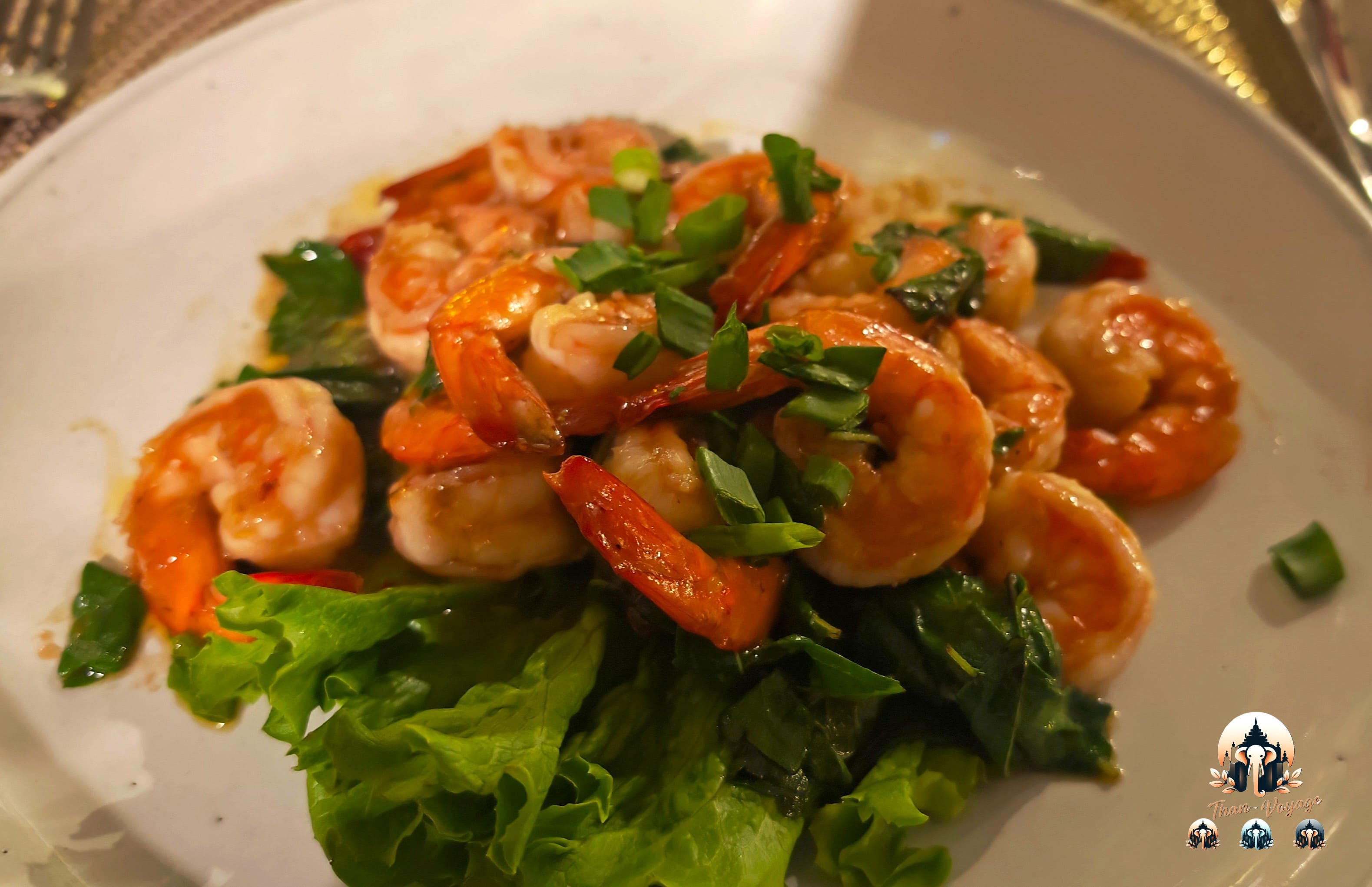La carte est assez simple, avec des plats asiatiques et quelques options plus occidentales. Nous optons tous les deux pour un plat de scampi, qui s’avère franchement délicieux après cette journée de trajet.