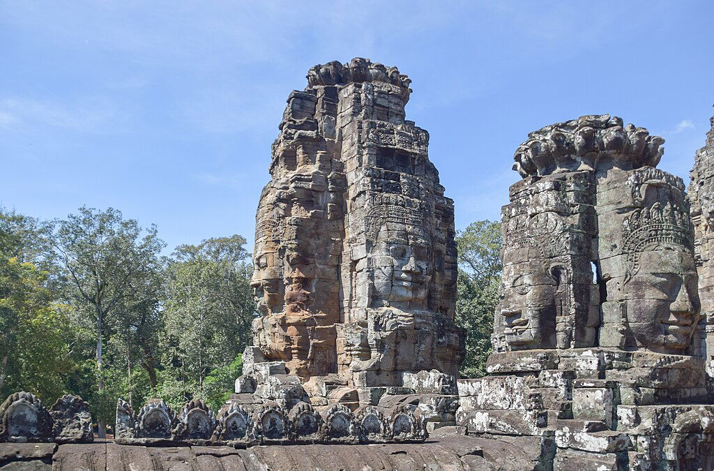Au cœur d’Angkor Thom se dresse le Bayon, temple d’État de Jayavarman VII. Construit à la fin du XIIᵉ siècle, il se distingue par ses tours monumentales décorées de visages colossaux, au sourire énigmatique.